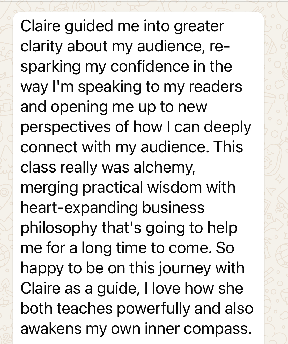 "I loved this session with Claire. It really helped me gain clarity about who I want to speak to and how I can best serve them through my content. We did a super helpful exercise exploring what our idea readers FEEL and what they WANT, which was gold :) Thank you!"