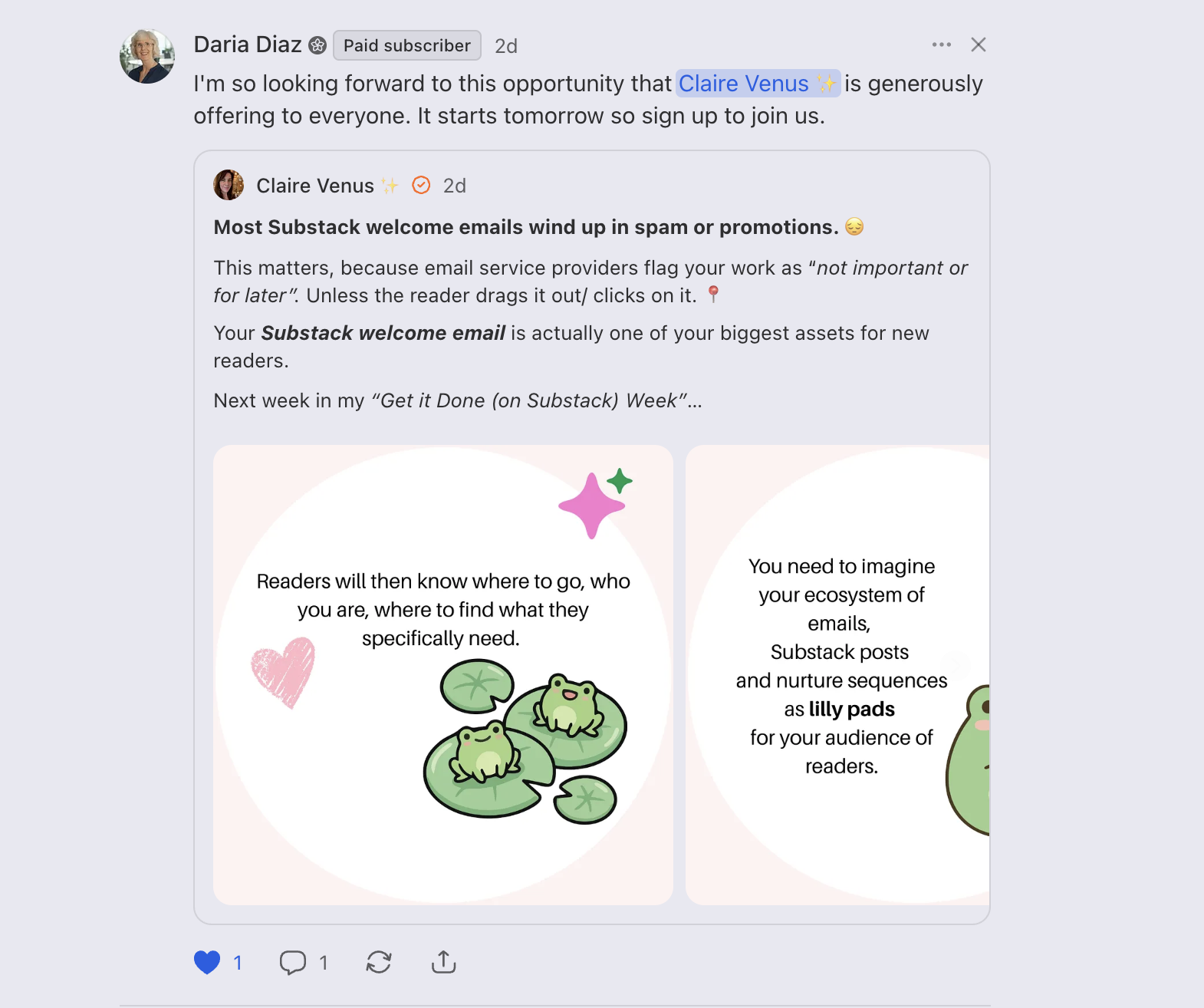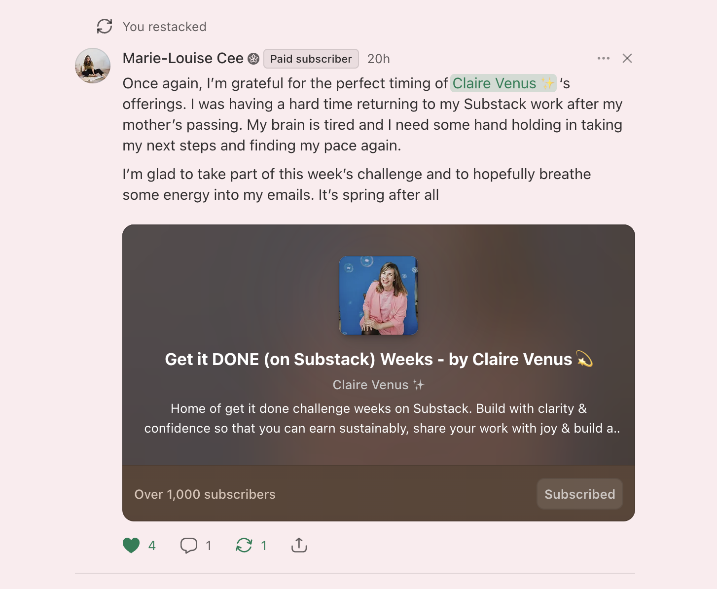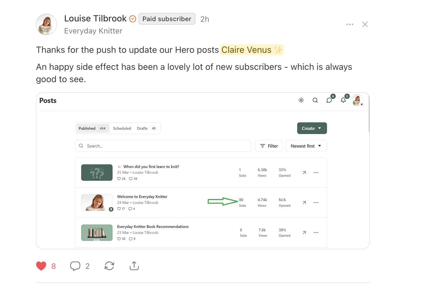 Hi, I'm Claire. I'm an Engagement Consultant and Mentor and I started my journey with Substack in 2022. I've built my audience to 15k readers across two publications, work with over 500 members and I'm so excited to share more with you. Come join us.