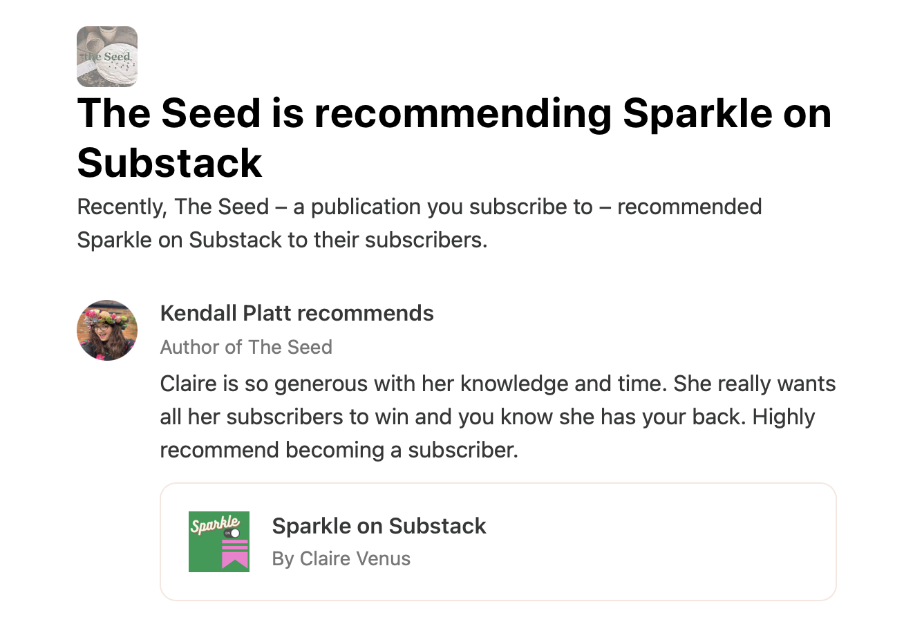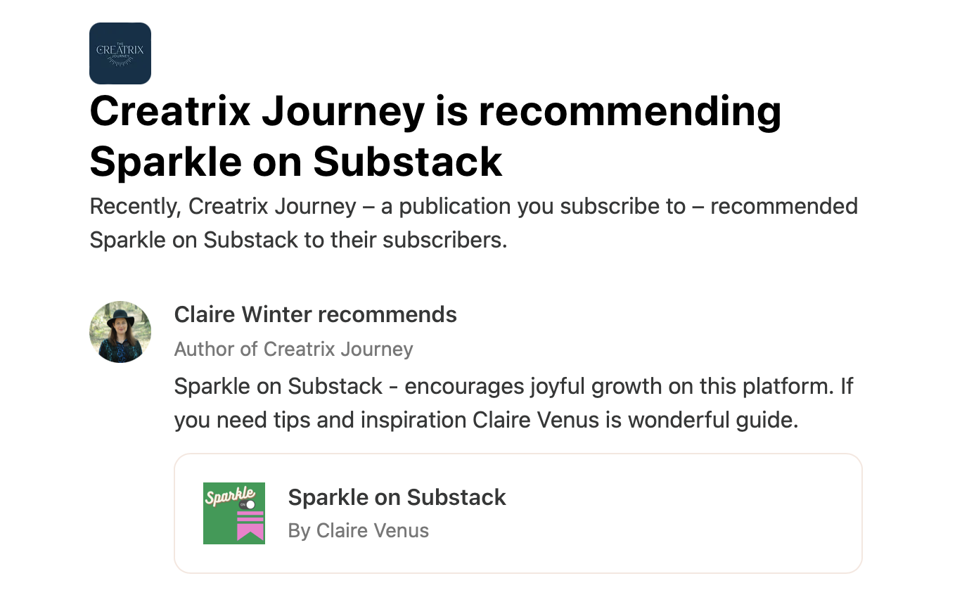 I joined Claire’s Business of Your Substack Mastermind and her Sparkle On Substack yearly membership. Both were game-changers for my growth and confidence.