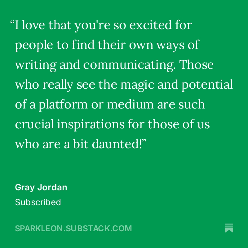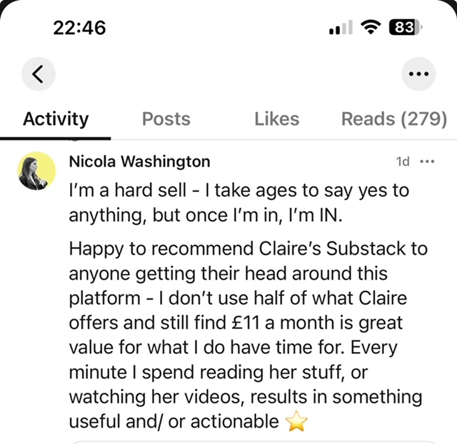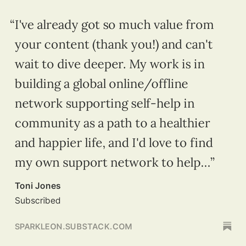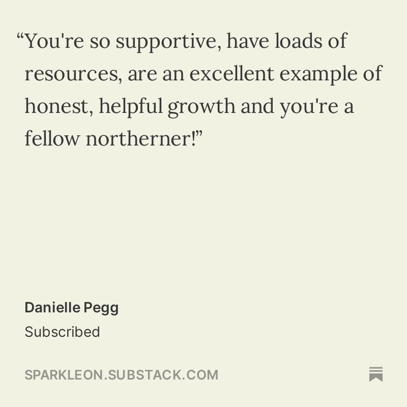 My membership Sparkle on Substack supports over 400 creatives, authors and entrepreneurs to grow their Substack on their terms. I've also been pleased to take on occasional 1-2-1 clients on referral.