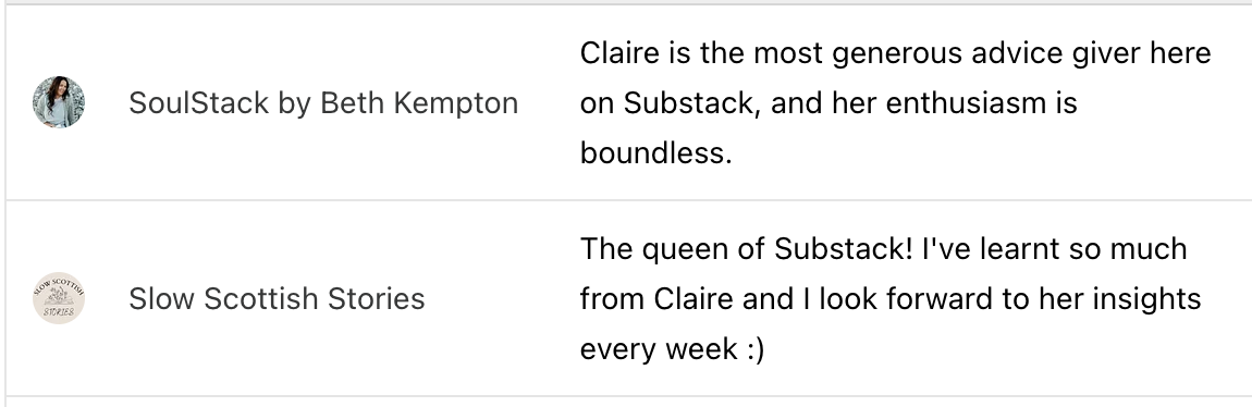 Hi, I'm Claire. I'm an Engagement Consultant and Mentor and I started my journey with Substack in 2022. I've built my audience to 15k readers across two publications, work with over 500 members and I'm so excited to share more with you. Come join us.