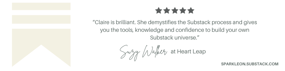 In the week after making a few suggested changes, I gained several new paid subscribers. It was really useful to see my Substack through the eyes of a professional, and it also helped me to get fresh clarity on the heart of my message. Claire is wise and balanced, and very generous with her time and expertise. I would recommend a Sparkle audit to anyone wanting to offer their writing the very best chance of being read. Thank you Claire!"